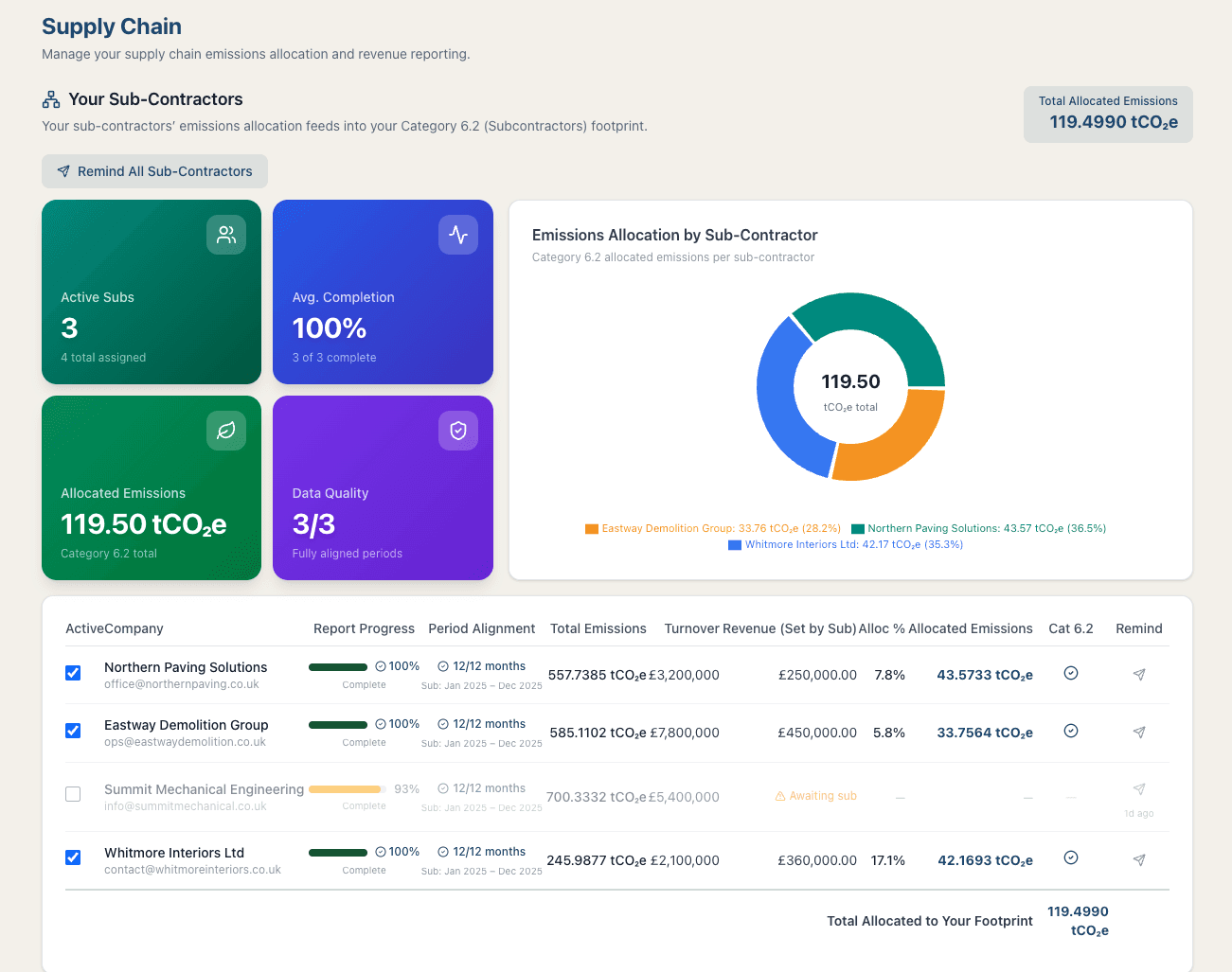 Invite sub-contractors into your supply chain. Each sub gets their own dedicated account to report emissions data, which flows directly into your Scope 3 (Category 6) reporting. Full visibility across your entire supply chain.
