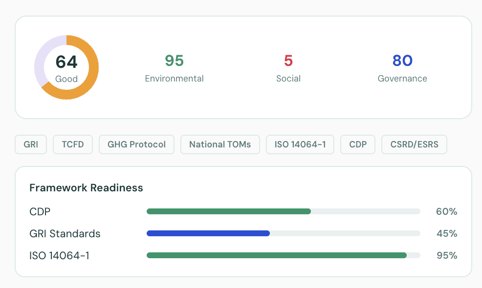 A weighted composite ESG score across Environmental (40%), Social (30%), and Governance (30%) pillars — aligned with internationally recognised frameworks. Understand your readiness for CDP, GRI, CSRD, and more.